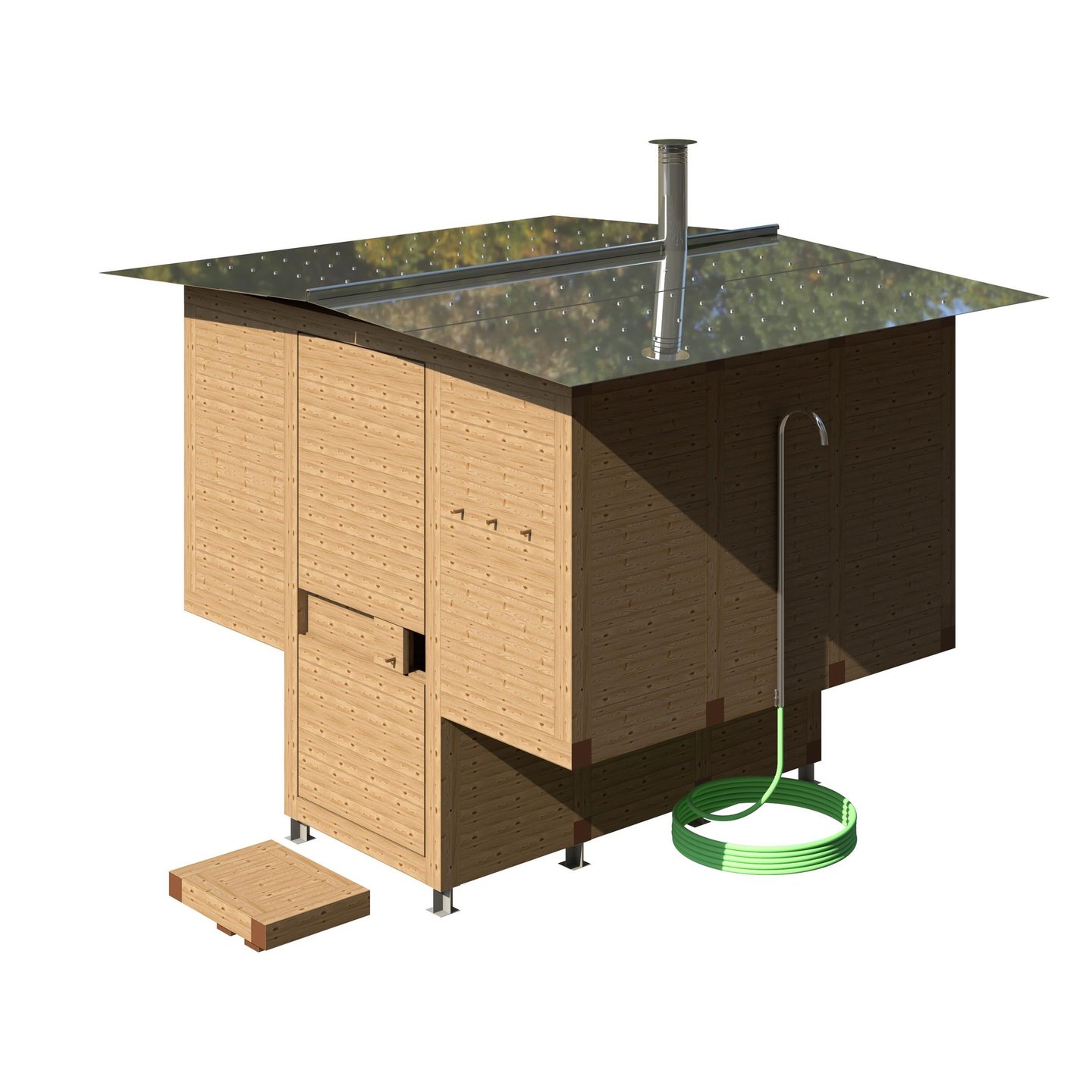 Due to its raised construction, the sauna appears to “float” above the ground, allowing natural air circulation beneath the floor and ensuring long-term structural durability.