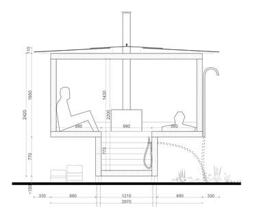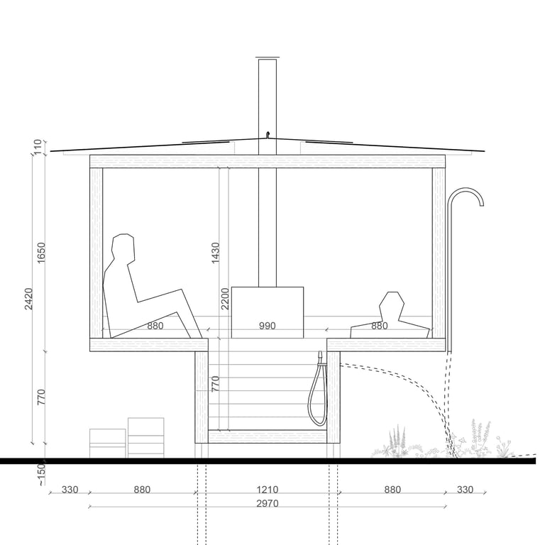 The proportions and interior dimensions are designed based on real sauna usage scenarios. Bench heights, distances, and seating and reclining zones are carefully calibrated according to ergonomic principles and traditional sauna practice.