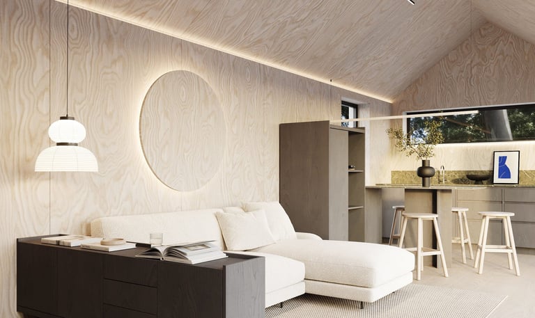 Interior plywood is available in its natural tone or can be treated with pigmented oil for color customization, allowing seamless integration into any design.